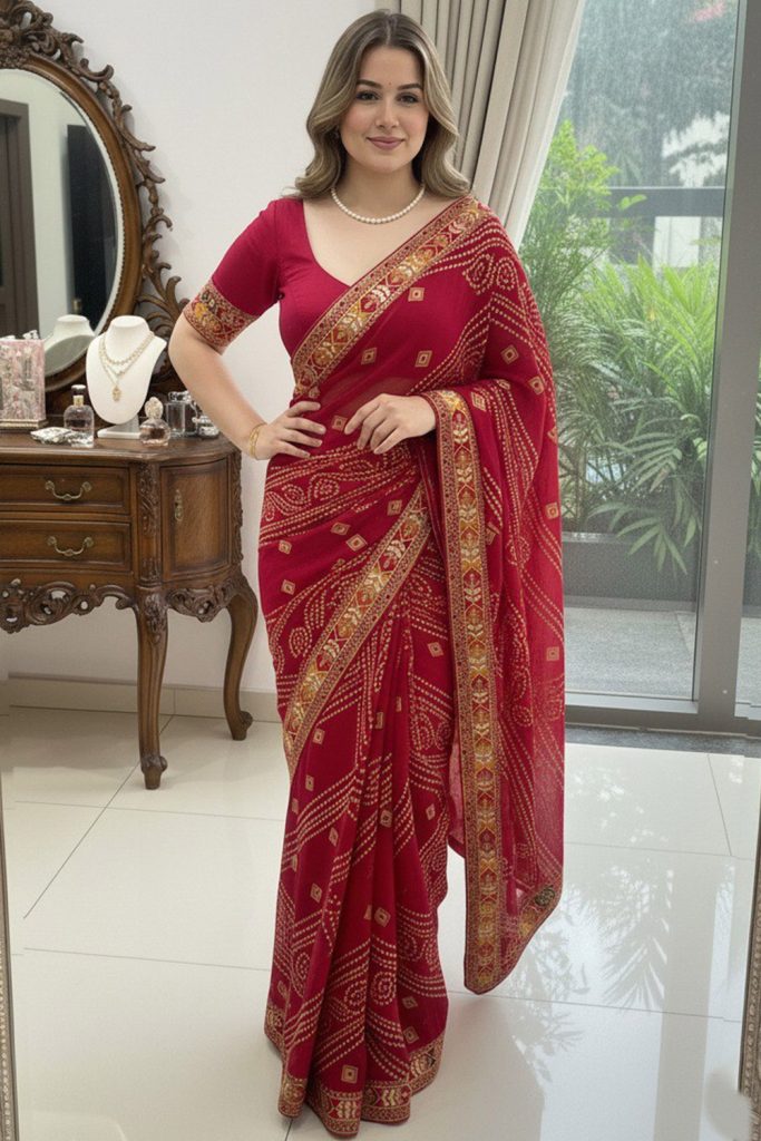Georgette sarees offer a slightly structured drape, making them an excellent choice for women who want a flattering silhouette that stays neat throughout the day. Their versatility suits both contemporary and traditional styling, and they pair effortlessly with embellished blouses for formal occasions.