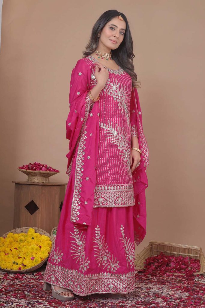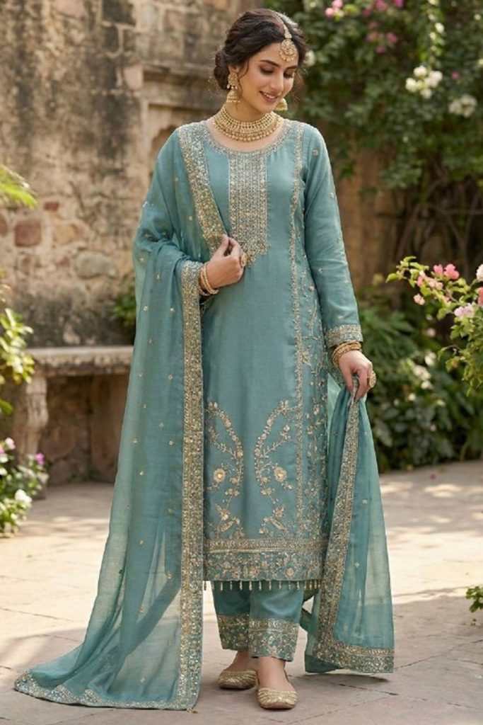 - Silk straight suits with intricate embroidery