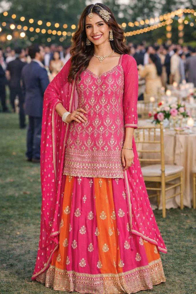 Lehengas are ideal for formal Eid dinners, festive photos, and evening gatherings where a more elaborate outfit is appropriate.