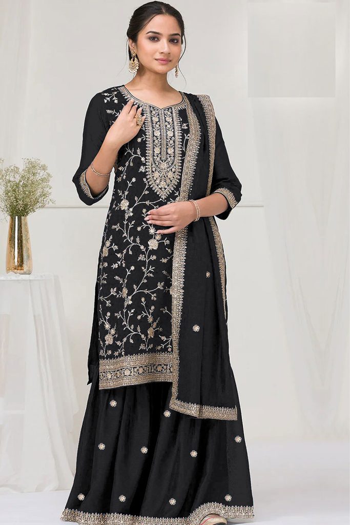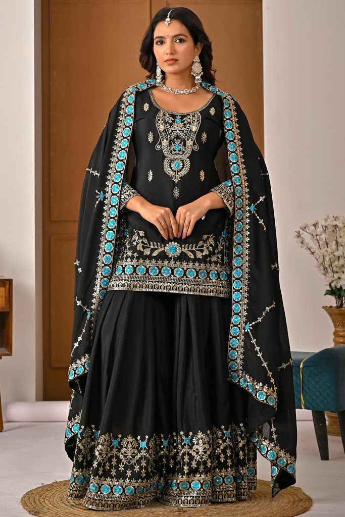 Classic black shararas with silver accents remain a strong and stylish choice. They offer a powerful and elegant look that feels timeless, making them a great option if you love a bold yet refined appearance.