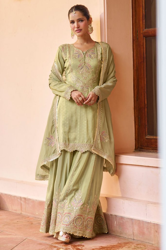Mint green shararas with floral embroidery offer a refreshing and cheerful look. They feel light and joyful, perfect for family lunches and garden gatherings, giving your outfit a soft and welcoming vibe.